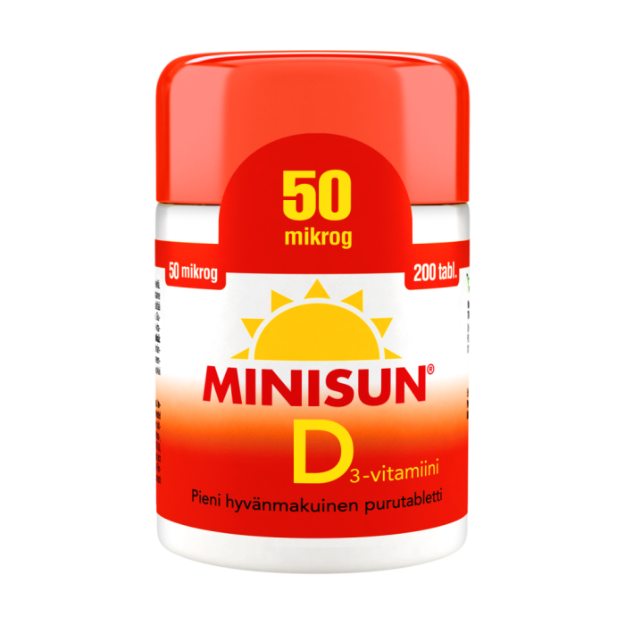 Minisun D-vitamintabletterna som utvecklats i Finland är ett enkelt sätt att trygga behovet av vitamin D året om. Minisun 50 mikrog innehåller vitamin D3 som effektivt tas upp i kroppen. Vitamin D förstärker motståndskraften och är ett viktigt vitamin för välmående benstomme, muskler och tänder. Doseringen är enkel - en liten tuggtablett per dag räcker till. Minisun 50 mikrogram är välsmakande och lämpar sig för unga, vuxna och äldre för ett effektiverat dagligt intag året om. Tabletterna är sötade med xylitol, och de kan tas både som sug- och tuggtabletter, sväljas hela eller krossas. Produkten innehåller varken laktos, gluten, jäst, soja eller gelatin.
