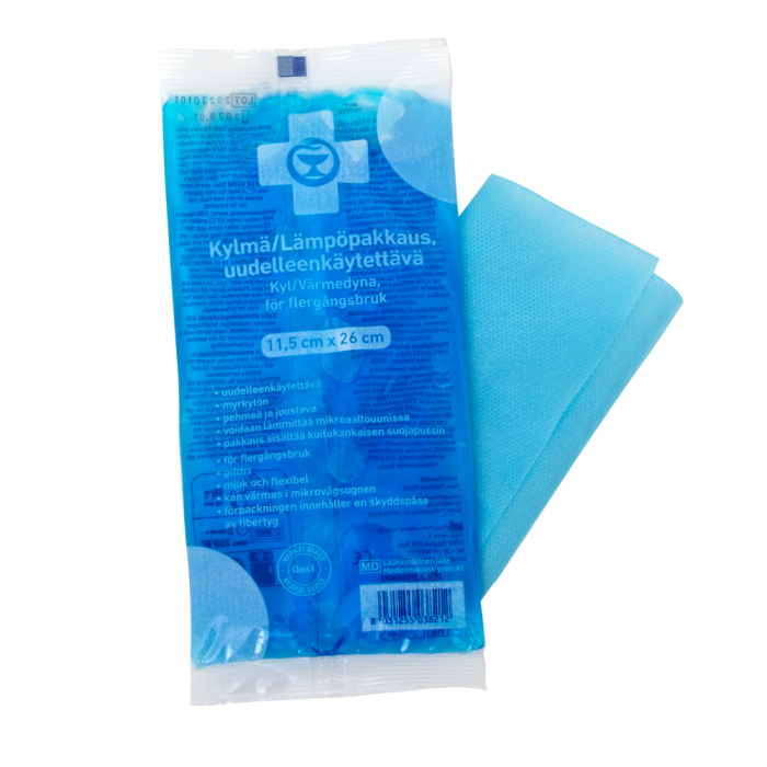 Kyl/värmedyna för flergångsbruk. Kan värmas i vattenbad i mikrovågsugn eller förvaras i frysen. Användningsändamål: Kyl/värmedyna för flergångsbruk. Kan värmas i vattenbad i mikrovågsugn eller förvaras i frysen. Kyl/värmedynan är giftfri, mjuk och smidig. Skyddspåse i fibertyg medföljer. Användningsindikationer som kall: blåmärken vrickningar bristningar skador insektsbett hypertermi och andra situationer där det behövs kylbehandling. Användningsindikationer som varm: ryggskott stel nacke hypotermi och andra situationer där det behövs värmebehandling. Dosering: Bruksanvisning kall: Förvara dynan i frysen. Om dynan är rumstempererad, sätt den i frysen för minst 2 timmar före användningen. Ta dynan från frysen och sätt den i fibertygspåsen som följde med i förpackningen eller i t.ex. en handduk. Placera dynan på området som ska behandlas. Bruksanvisning varm: Värm dynan i hett vatten (max 60°C) i högst 10 minuter eller värm den i mikrovågsugn: placera den i ett mikrotåligt kärl och